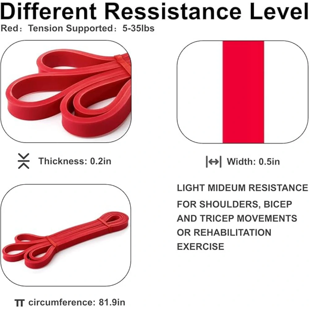 | المواصفات | باور باند (15–35 lbs) الألوان: أصفر، أزرق، أخضر، أسود، أحمر المميزات: مقاومة 15–35 رطل مناسبة للعقلة، الشد، وتمارين القوة. مصنوع من لاتكس طبيعي متين بمرونة عالية. طول 208 سم بتصميم حلقي مريح. استخدامات متعددة لكل عضلات الجسم، مناسب للرجال والنساء. |