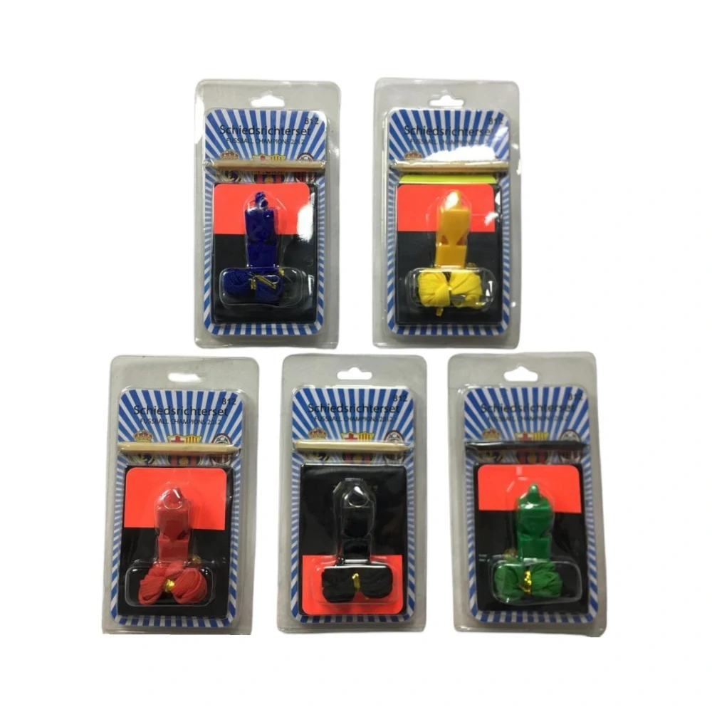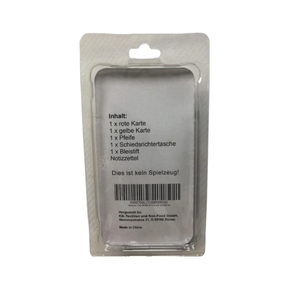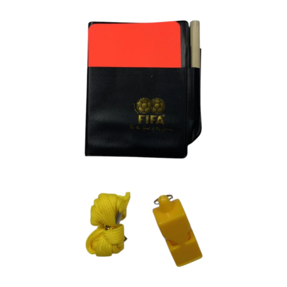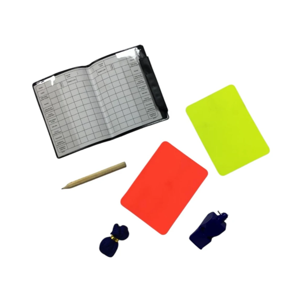 | المواصفات | طقم كروت وصفارة حكم الألوان: أسود، أخضر، أزرق، أحمر، أصفر المكونات: بطاقة حمراء، بطاقة صفراء، حافظات سوداء، صفارة بحبل تعليق، دفتر حكم، قلم رصاص المميزات: أدوات متينة وواضحة الألوان لتسجيل أحداث المباريات وإدارة اللعب بشكل احترافي الاستخدام: مناسبة لجميع مستويات الحكام للحفاظ على النظام والعدالة في المباريات، أدوات احترافية وليست لعبة |